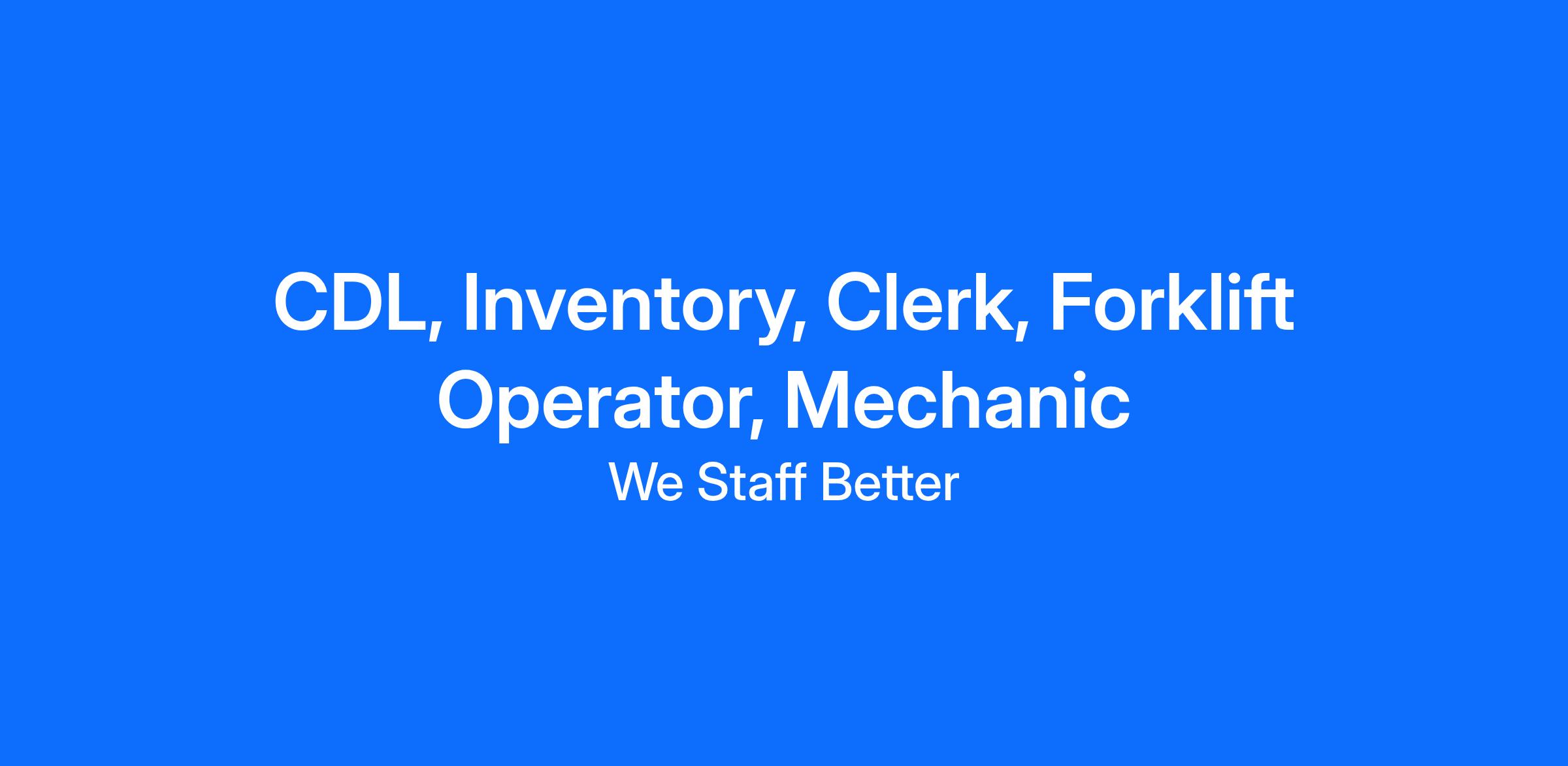 CDL, Inventory, Clerk, Forklift Operator, Mechanic