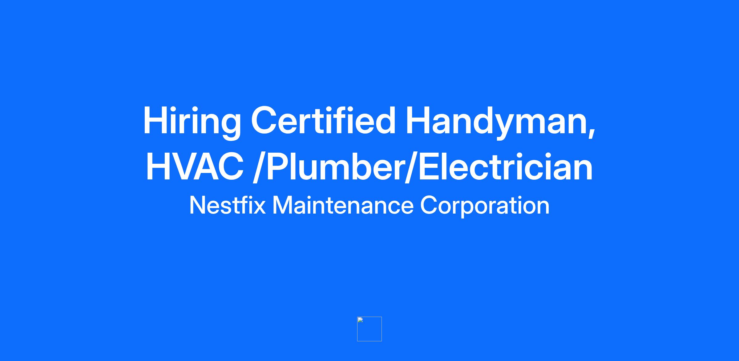 NestFix Maintenance Corp. is looking for certified Handyman,HVAC /Plumber/Electrical technicians to join our team. The Handyman,HVAC /Plumber/Electrical will be based out of our NewYork office and is responsible for providing on-site client installation, repairs, and maintenance of the issues.