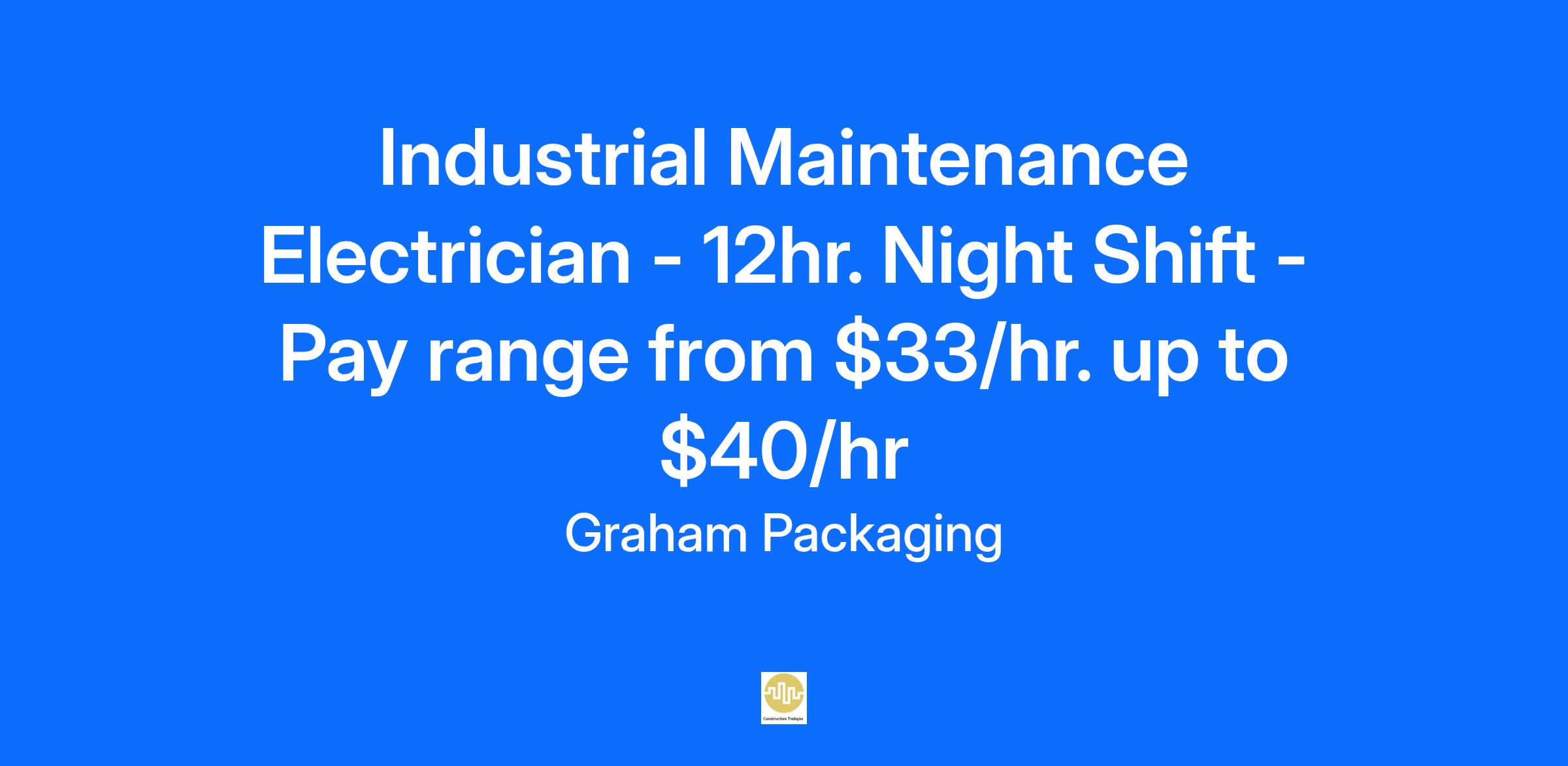 Graham Packaging Company is looking for an Industrial Maintenance Electrician based in Bradford, PA. This opening is for Night Shift alternating with a 12-hour schedule, which operates during the hours from 7pm to 7am.